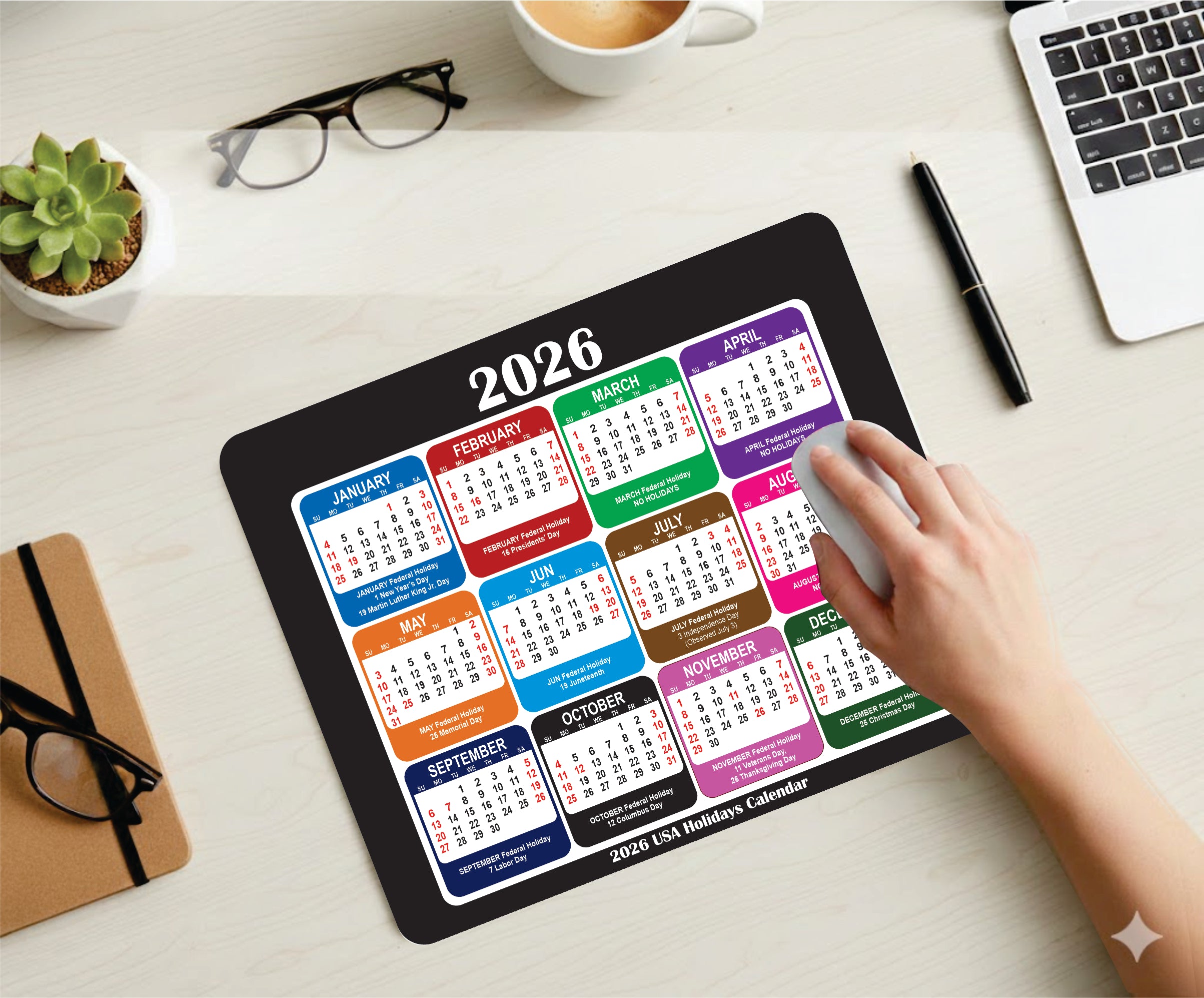 2026 Calendar Mouse Pad with Holidays Non-Slip Rubber Base Desk Mat Office Gift